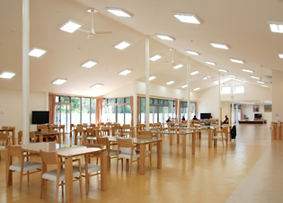 そこで当施設は、太陽光をふんだんに取り入れる設計となっており、施設内は明るく開放的で、快適な環境空間となっております。また、太陽光発電システムやホール等のLED照明などエコ対策への取り組みも致しております。